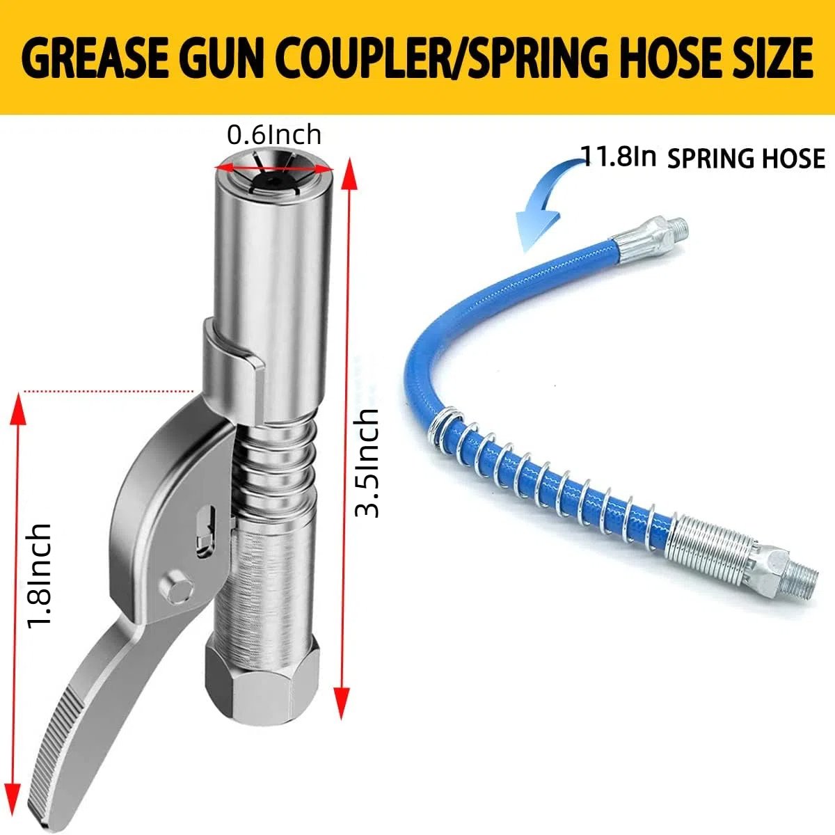 Uzamykanie a utesnenie: Upevňovacie spojky mazacej pištole vylepšené, extra zosilnený dizajn so 6 čeľusťami zvyšuje odolnosť a životnosť, ľahšie sa nasadzujú a uvoľňujú mazacie spojky, zosilnené čeľuste a prémiové tesniace tesnenie zaisťujú dlhotrvajúci a stabilný výkon, netečie ani pri extrémnom tlaku 12 000 PSI.